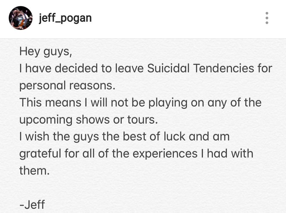 Guitarist Jeff Pogan has only been with Suicidal Tendencies since 2016, but his time with the band has come to an end. Pagan cited only “personal reasons” for his decision to leave in a statement posted to his personal Instagram (which is private; screen shot here), but whatever those reasons are must’ve been pretty serious and/or urgent: the band is set to kick off a tour in less than two weeks. Here’s his statement in full: